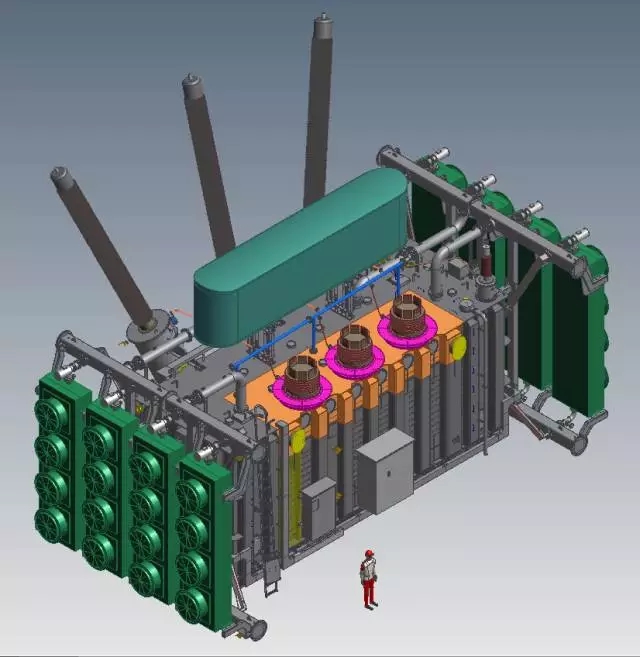 鐵芯框架采用高強度合金鋼材打造,給變壓器其它部件強有力的支撐;引線(xiàn)的連接布置復雜但合理,讓上萬(wàn)安培的大電流在變壓器內部的流動(dòng)井然有序。簡(jiǎn)單來(lái)說(shuō),變壓器內的繞組,鐵芯,與器身組成了結實(shí)可靠的內部結構,讓這個(gè)大塊頭有一顆強大的“心”。